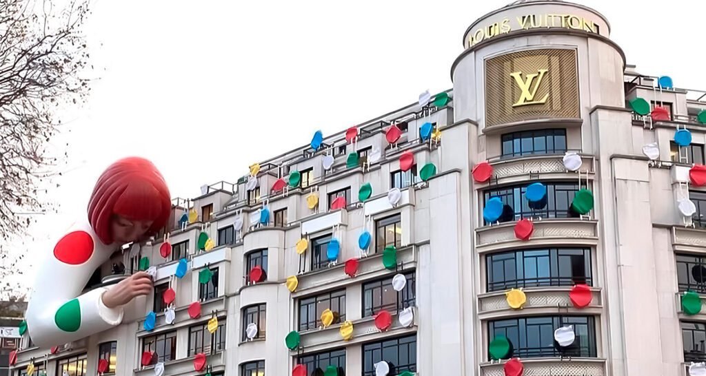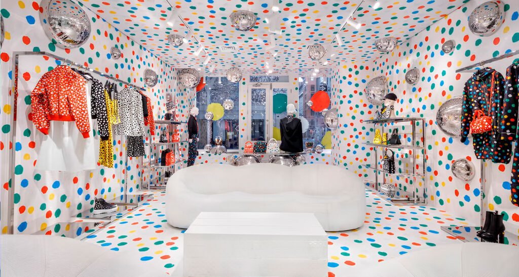 La colección debutó en Tokio y luego conquistó Nueva York, con instalaciones inmersivas en las que maniquíes hiperrealistas de Kusama “pintaban” las tiendas desde dentro.